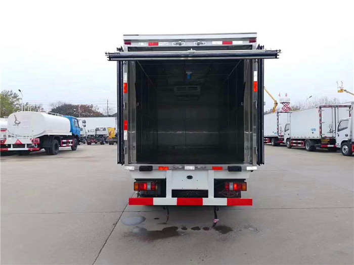 一 厢体配置:采用我公司晶龙工艺制造《专用磨具压制成型》,保温性能达到国家A级标准保温材料为无空隙填充聚氨酯发泡,厢体全面采用优质玻璃钢制造,树脂胶无缝粘连,后门全密封双开门,不锈钢后门合页及锁件,厢体内部采用LED照明灯及厢体示灯。 二 选装冷机:可根据客户的用车需求选择不同的机组,客户可选-5℃、-10℃至-18℃冷藏机组,冷藏机组品牌有国产劲达K牌,韩亚·韩雪·华泰·松寒·凯雪·超酷;等冷藏机组,进口冷藏机组品牌有;美国开力·美国冷王·冷藏机分为独立机组和分体机组,该车型选装`制冷+加热`双温机组,(控制温度范围为+20°C至-18°C)可用于东北地区内蒙 新疆 西藏等严寒地区。